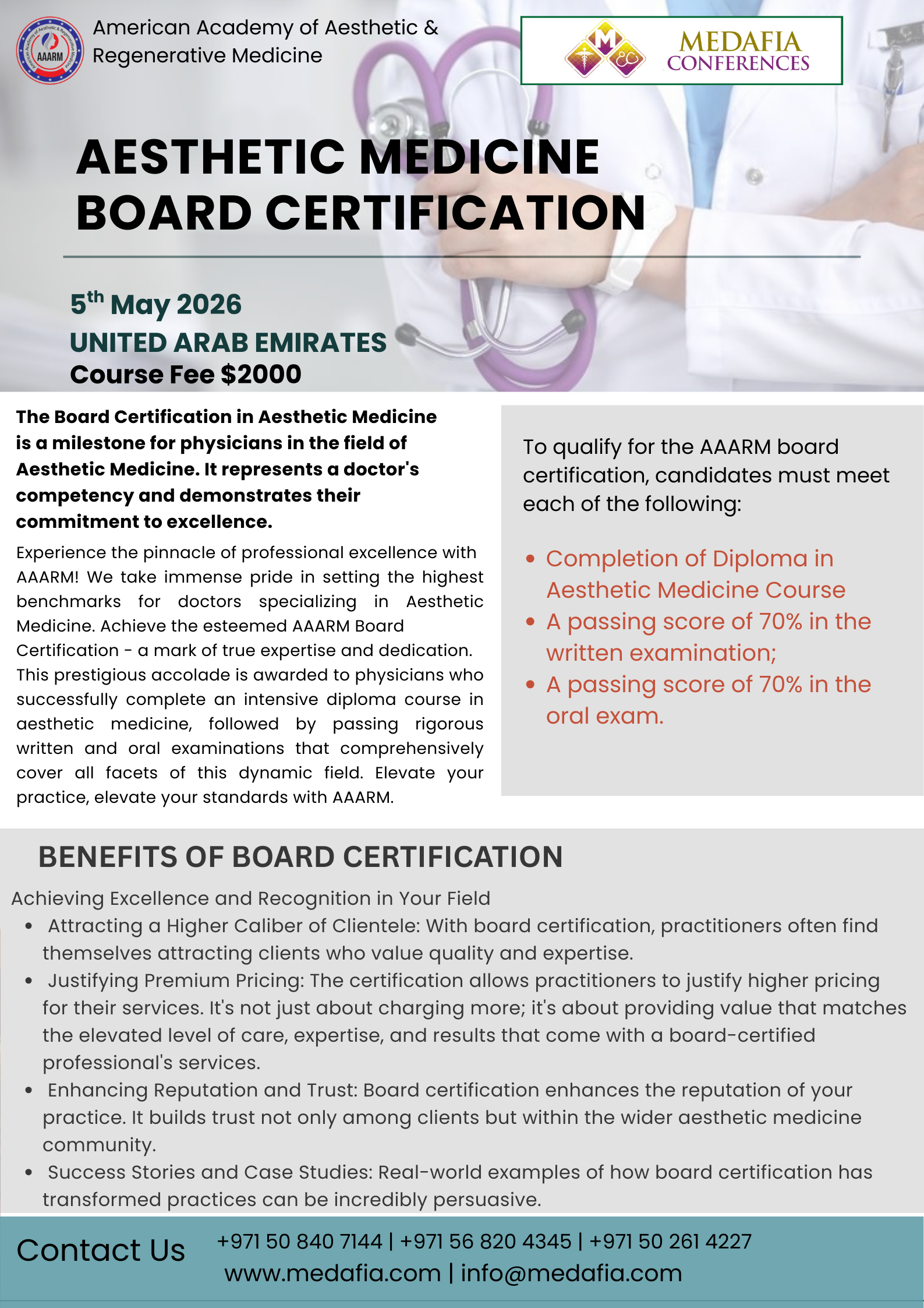 Enhancing Reputation and Trust: Board certification enhances the reputation of your practice. It builds trust not only among clients but within the wider aesthetic medicine community. This reputation can lead to increased referrals, higher client retention rates, and an overall stronger presence in the market.