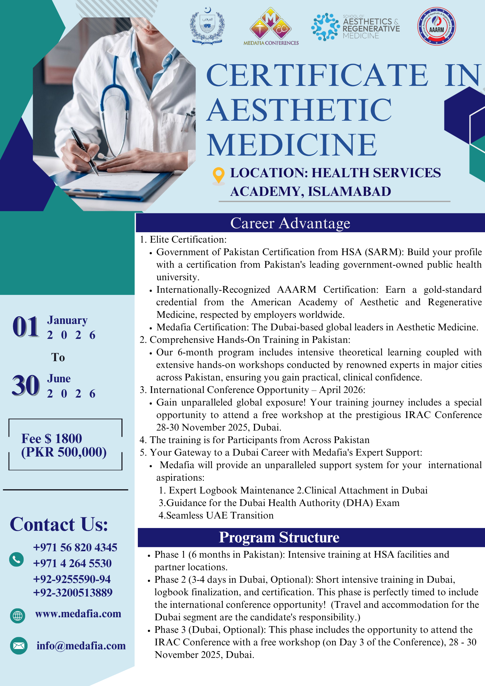 The Certificate in Aesthetic Medicine offered at Health Services Academy, Islamabad, is a 6-month professional training program designed to provide comprehensive theoretical knowledge and practical, hands-on experience in aesthetic medicine. This elite certification is endorsed by the Government of Pakistan, internationally recognized by the American Academy of Aesthetic and Regenerative Medicine (AAARM), and supported by Medafia Conferences, a global leader in aesthetic medicine education. The program equips participants with advanced clinical skills through workshops conducted by renowned experts across Pakistan, while also offering international exposure with optional training and certification opportunities in Dubai. Graduates gain a competitive edge for both local and international careers, supported by expert logbook maintenance, clinical attachments in Dubai, and guidance for the Dubai Health Authority (DHA) exam.
