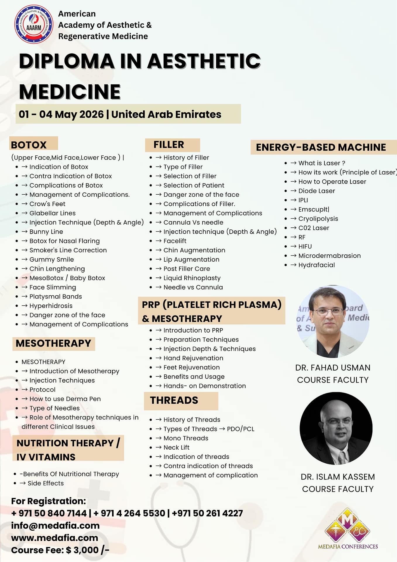 7. Certification: Upon successful completion, participants will receive a Diploma in Aesthetic Medicine Certificate, accredited with 32 Credit hours certificate by AAARM, recognized both locally and internationally.