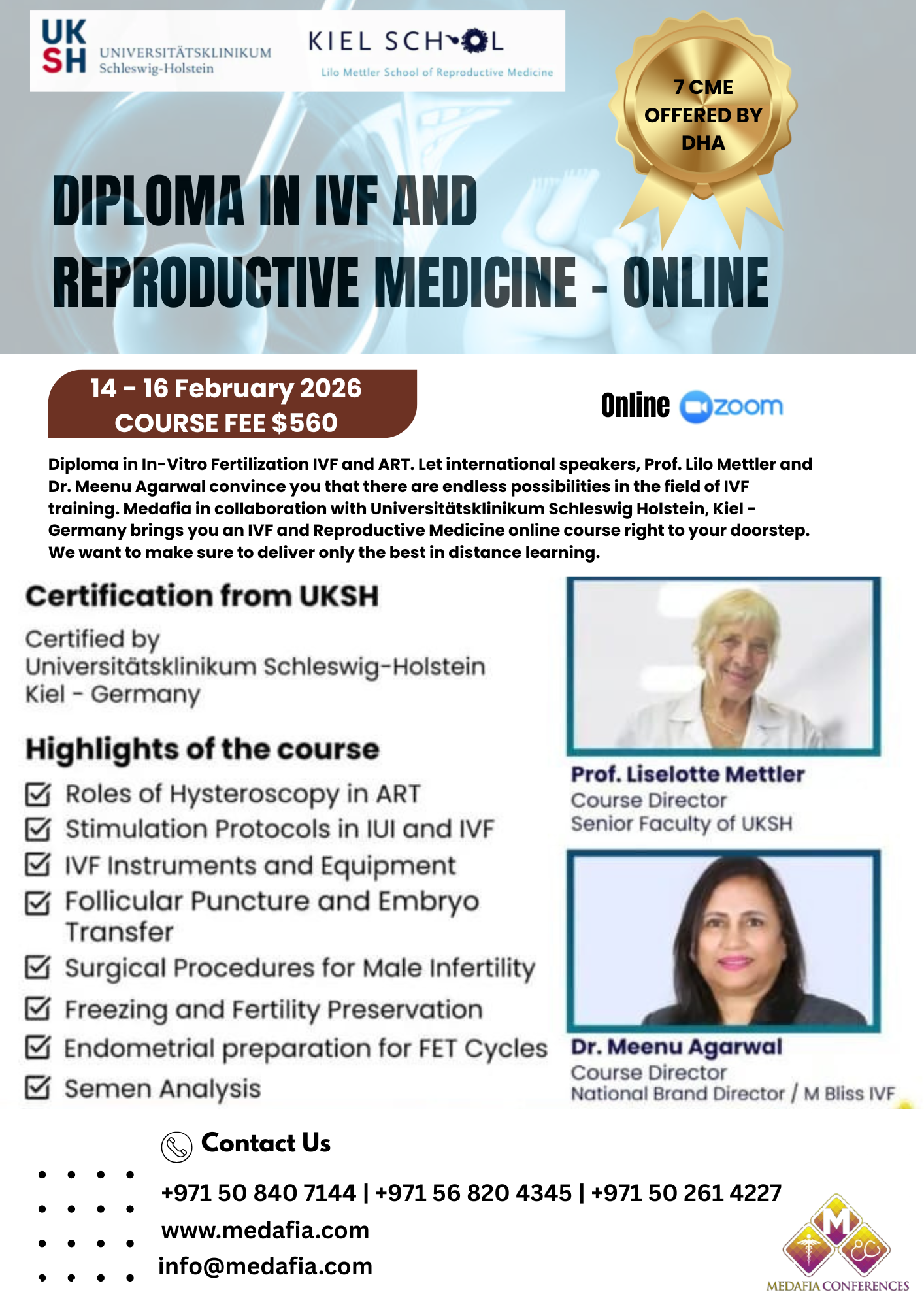 Diploma in IVF and Reproductive Medicine. Let international speakers, Prof. Lilo Mettler and Dr. Meenu Agarwal convince you that there are endless possibilities in the field of IVF training. Medafia in collaboration with Universitätsklinikum Schleswig Holstein, Kiel – Germany brings to you an IVF and Reproductive Medicine online course right to your doorsteps. We want to make sure to deliver only the best in distance learning.