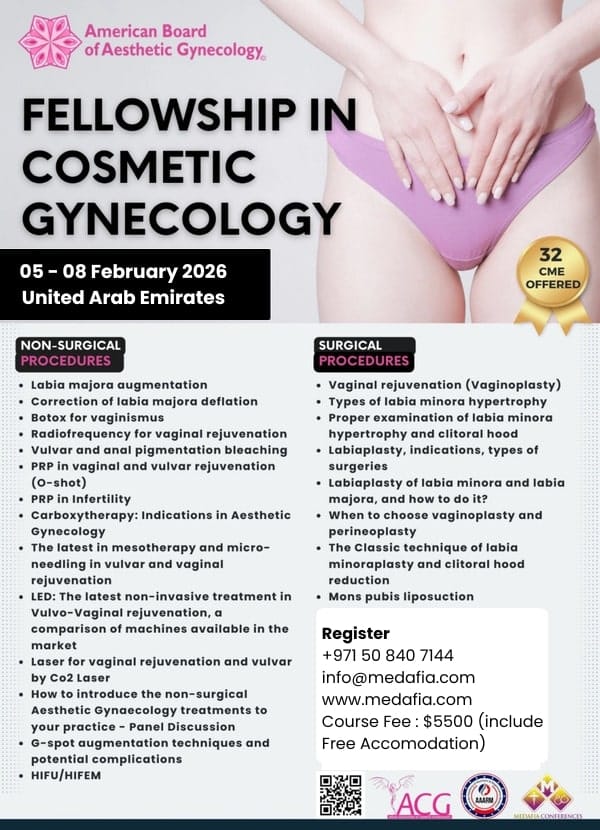 Welcome to our globally recognized Fellowship in Cosmetic Gynecology. This comprehensive program, in collaboration with the American Board of Aesthetic Gynecology, offers a fully packed 4-day course featuring one-on-one surgical and non-surgical training in the UAE. Participants will experience unparalleled Cosmetic Gynecology Education, merging both surgical and non-surgical approaches, with a full hands-on lecture series led by international faculties. Designed for Gynecology Specialists Training, our fellowship caters to medical professionals seeking to advance skills in the dynamic field of cosmetic gynecology.